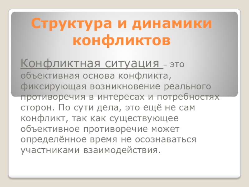Структура и динамики конфликтовКонфликтная ситуация – это объективная основа конфликта, фиксирующая возникновение реального противоречия в интересах и