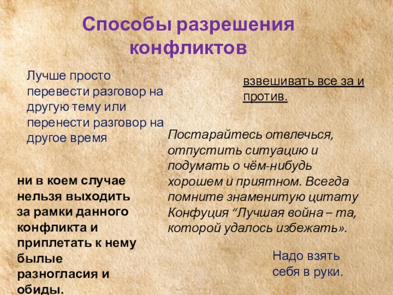 Постарайтесь отвлечься, отпустить ситуацию и подумать о чём-нибудь хорошем и приятном. Всегда помните знаменитую цитату Конфуция “Лучшая война – та, которой удалось избежать».