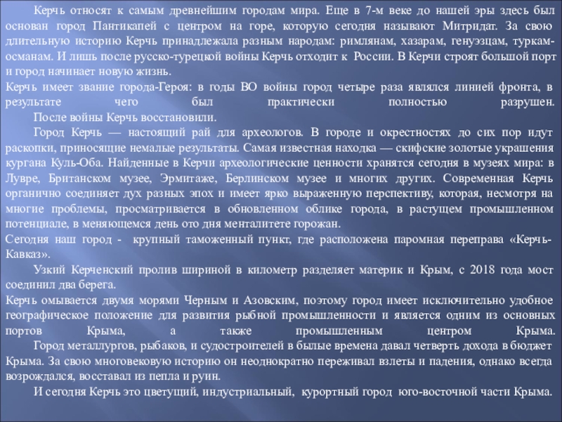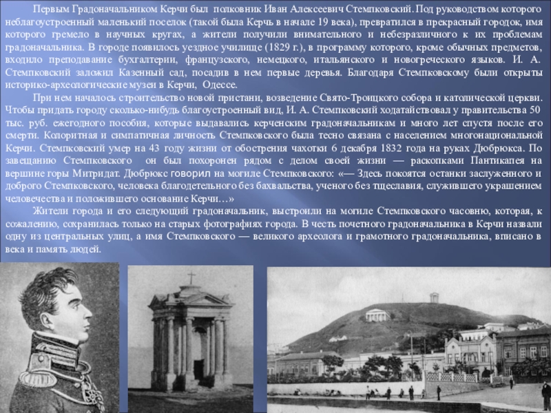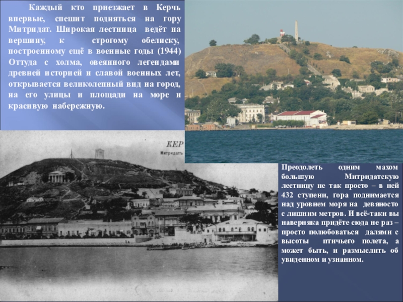 Преодолеть одним махом большую Митридатскую лестницу не так просто – в ней 432 ступени, гора поднимается над уровнем моря на девяносто с лишним метров. И всё-таки вы наверняка придёте сюда не раз – просто полюбоваться далями с высоты птичьего полета, а может быть, и размыслить об увиденном и узнанном.