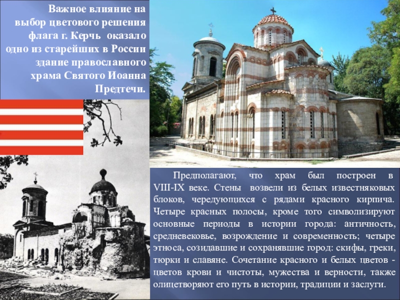 Важное влияние на выбор цветового решения флага г. Керчь оказало одно из старейших в России здание православного храма Святого Иоанна Предтечи.
