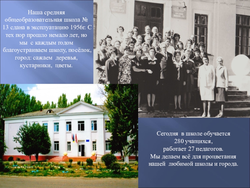 Наша средняя общеобразовательная школа № 13 сдана в эксплуатацию 1956г. С тех пор прошло немало лет, но мы с каждым годом благоустраиваем школу, посёлок, город: сажаем деревья, кустарники, цветы.