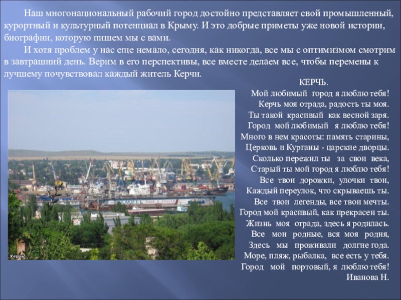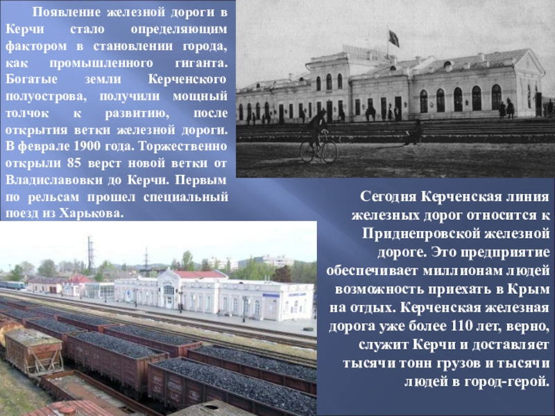 Сегодня Керченская линия железных дорог относится к Приднепровской железной дороге. Это предприятие обеспечивает миллионам людей возможность приехать в Крым на отдых. Керченская железная дорога уже более 110 лет, верно, служит Керчи и доставляет тысячи тонн грузов и тысячи людей в город-герой.