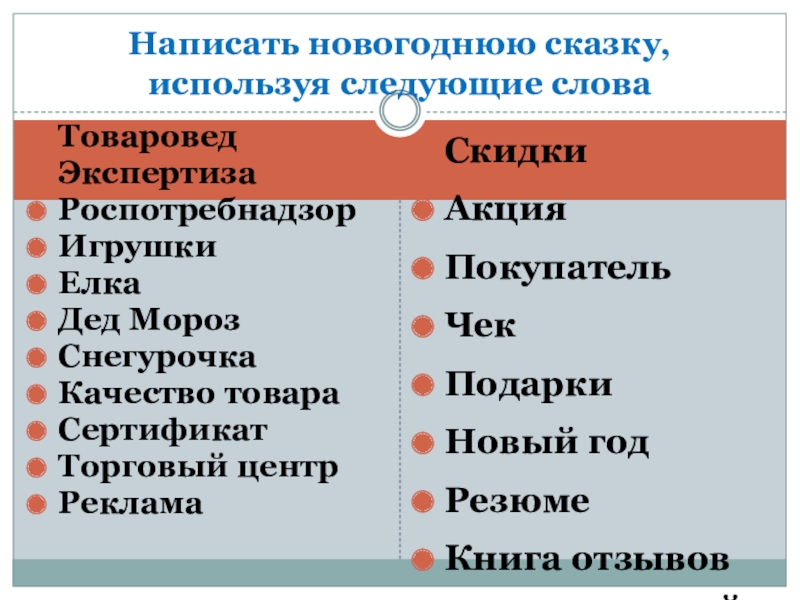ТовароведЭкспертизаРоспотребнадзорИгрушкиЕлкаДед МорозСнегурочкаКачество товараСертификатТорговый центрРекламаСкидкиАкцияПокупательЧекПодаркиНовый годРезюмеКнига отзывов и предложенийНаписать новогоднюю сказку, используя следующие слова