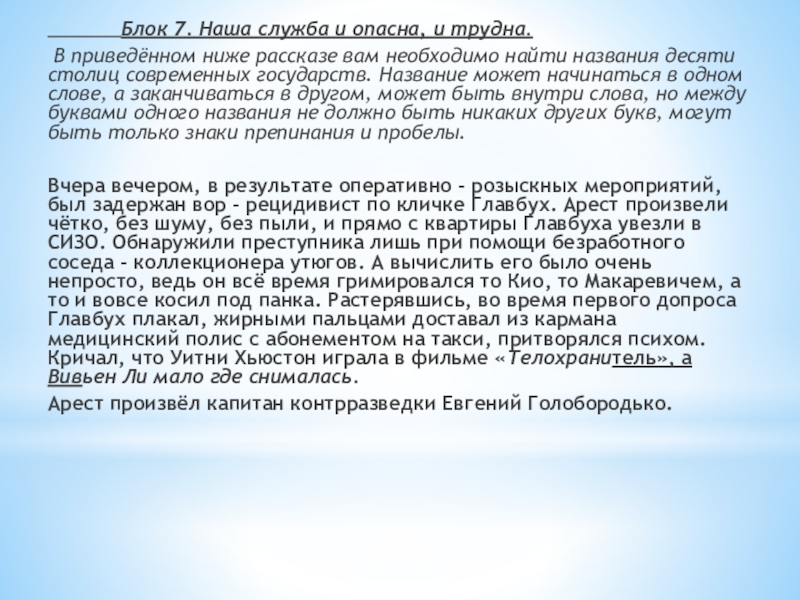 В приведённом ниже рассказе вам необходимо найти названия десяти столиц современных государств. Название может начинаться в одном слове, а заканчиваться в другом, может быть внутри слова, но между буквами одного названия не должно быть никаких других букв, могут быть только знаки препинания и пробелы.