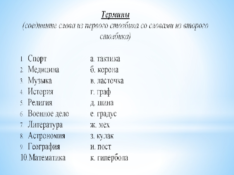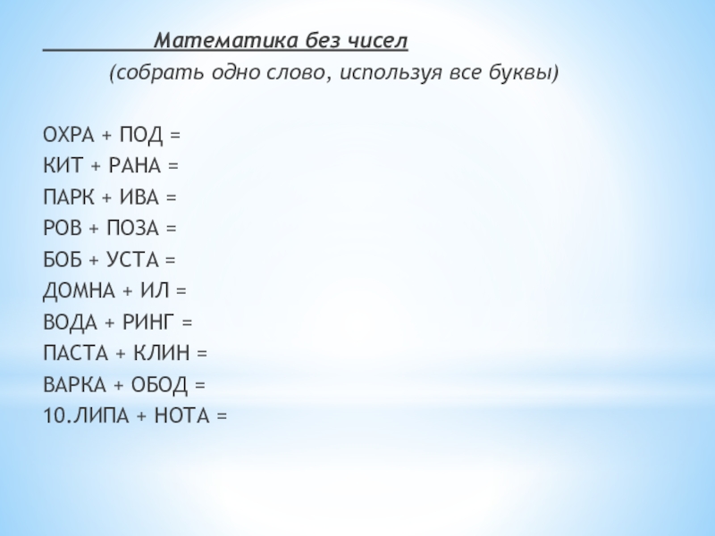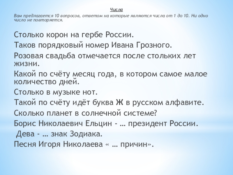 ЧислаВам предлагается 10 вопросов, ответом на которые являются числа от 1 до 10. Ни одно число не