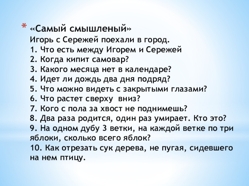 и Сережей 2. Когда кипит самовар? 3. Какого месяца нет в календаре? 4. Идет ли дождь два дня подряд?   5. Что можно видеть с закрытыми глазами? 6. Что растет сверху  вниз? 7. Кого с пола за хвост не поднимешь? 8. Два раза родится, один раз умирает. Кто это? 9. На одном дубу 3 ветки, на каждой ветке по три яблоки, сколько всего яблок? 10. Как отрезать сук дерева, не пугая, сидевшего на нем птицу.