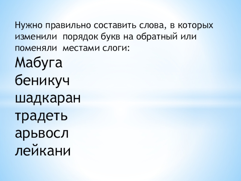 Нужно правильно составить слова, в которых  изменили  порядок букв на обратный или  поменяли  местами слоги:Мабугабеникуч шадкаран традеть арьвосл лейкани