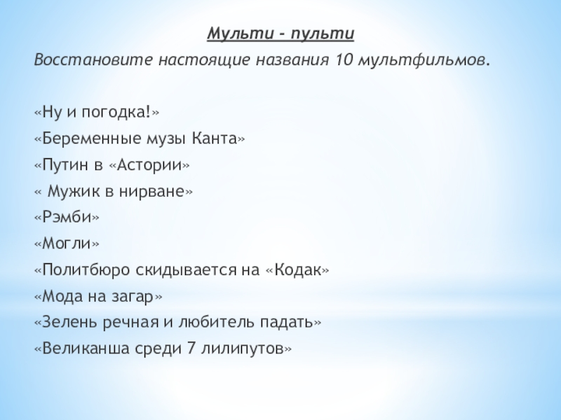 Мульти - пультиВосстановите настоящие названия 10 мультфильмов. «Ну и погодка!»«Беременные музы Канта»«Путин в «Астории»« Мужик в нирване»«Рэмби»«Могли»«Политбюро скидывается