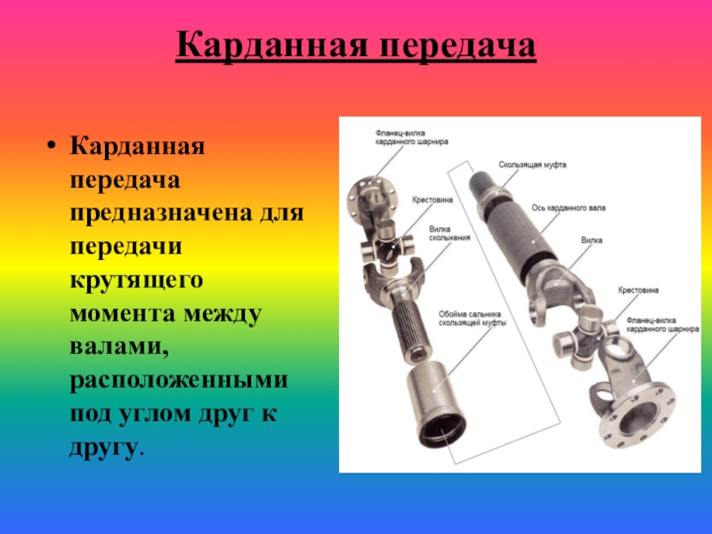 Карданная передача Карданная передача предназначена для передачи крутящего момента между валами, расположенными под углом друг к другу.