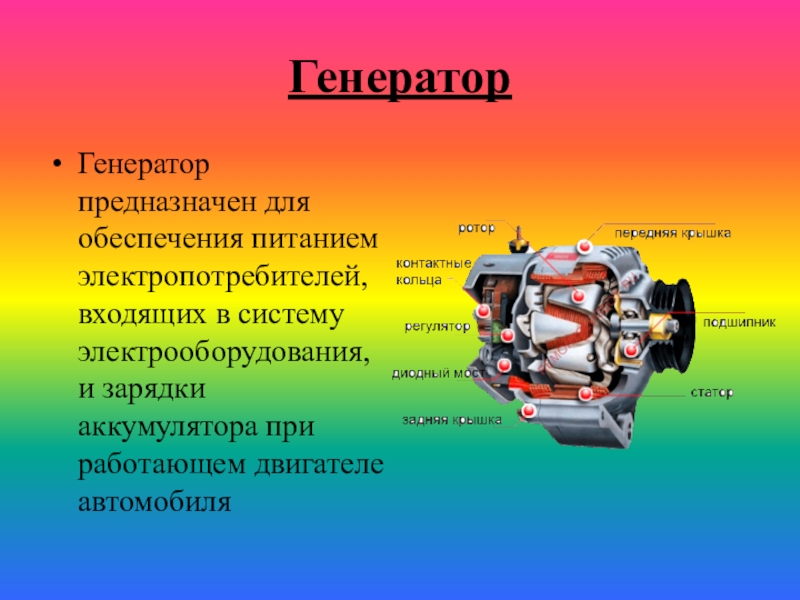 Генератор предназначен для обеспечения питанием электропотребителей, входящих в систему электрооборудования, и