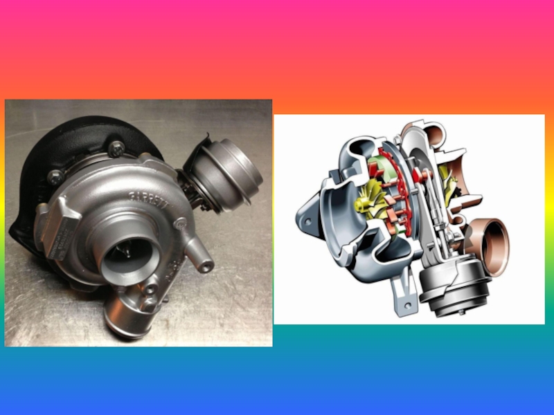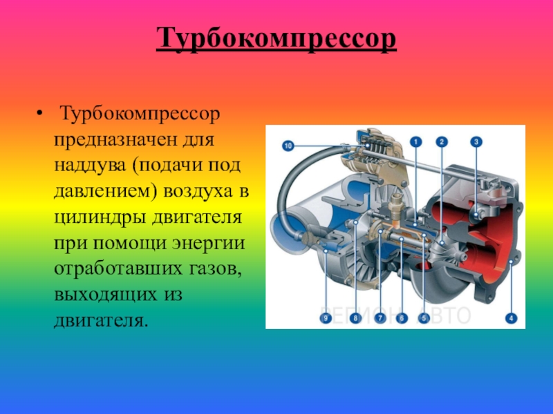 Турбокомпрессор  Турбокомпрессор предназначен для наддува (подачи под давлением) воздуха в цилиндры двигателя при помощи энергии отработавших газов,