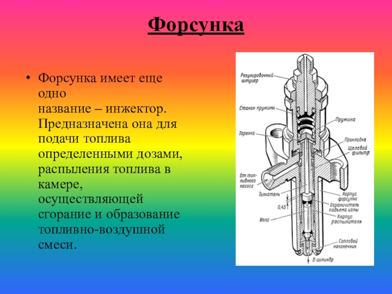 Форсунка Форсунка имеет еще одно название – инжектор. Предназначена она для подачи топлива определенными дозами, распыления топлива в камере,