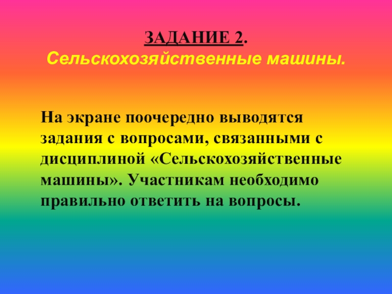 ЗАДАНИЕ 2.  Сельскохозяйственные машины.На экране поочередно выводятся задания с вопросами, связанными с дисциплиной «Сельскохозяйственные машины». Участникам