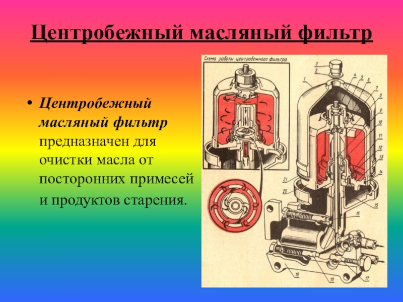 Центробежный масляный фильтр Центробежный масляный фильтр  предназначен для очистки масла от посторонних примесей и продуктов старения.