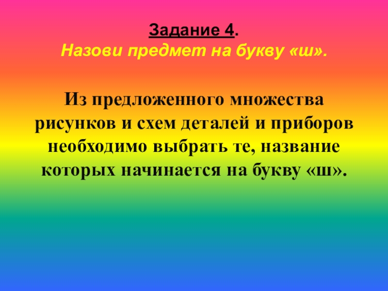 Задание 4.  Назови предмет на букву «ш».Из предложенного множества рисунков и схем деталей и приборов необходимо выбрать