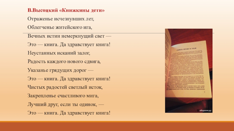 В.Высоцкий «Книжкины дети»Отраженье исчезнувших лет,Облегченье житейского ига,Вечных истин немеркнущий свет —Это — книга. Да здравствует книга!Неустанных исканий