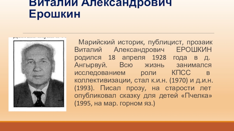 Виталий Александрович Ерошкин   Марийский историк, публицист, прозаик Виталий Александрович ЕРОШКИН родился 18 апреля 1928 года в д.