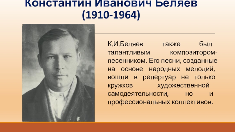 Константин Иванович Беляев (1910-1964)К.И.Беляев также был талантливым композитором-песенником. Его песни, созданные на основе народных мелодий, вошли в