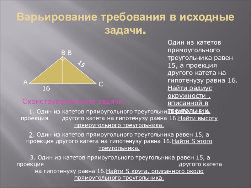 1. Один из катетов прямоугольного треугольника равен 15, а проекция другого катета на гипотенузу равна 16.Найти высоту прямоугольного треугольника.