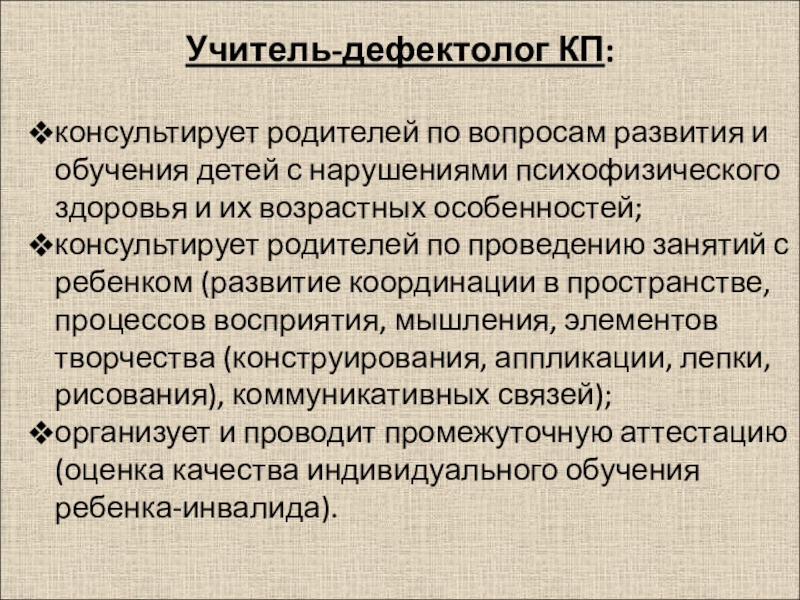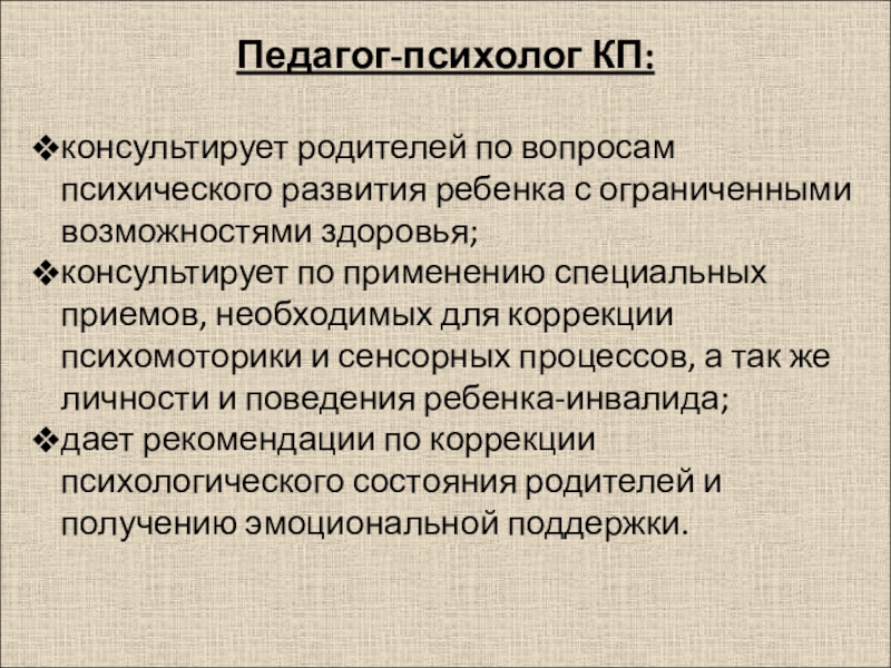 консультирует родителей по вопросам психического развития ребенка с ограниченными
