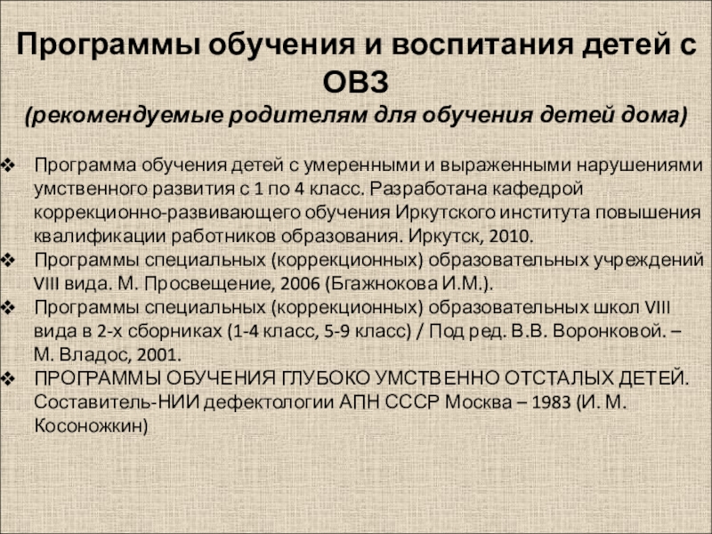 ПРОГРАММЫ ОБУЧЕНИЯ ГЛУБОКО УМСТВЕННО ОТСТАЛЫХ ДЕТЕЙ. Составитель-НИИ дефектологии АПН СССР Москва – 1983 (И. М. Косоножкин)