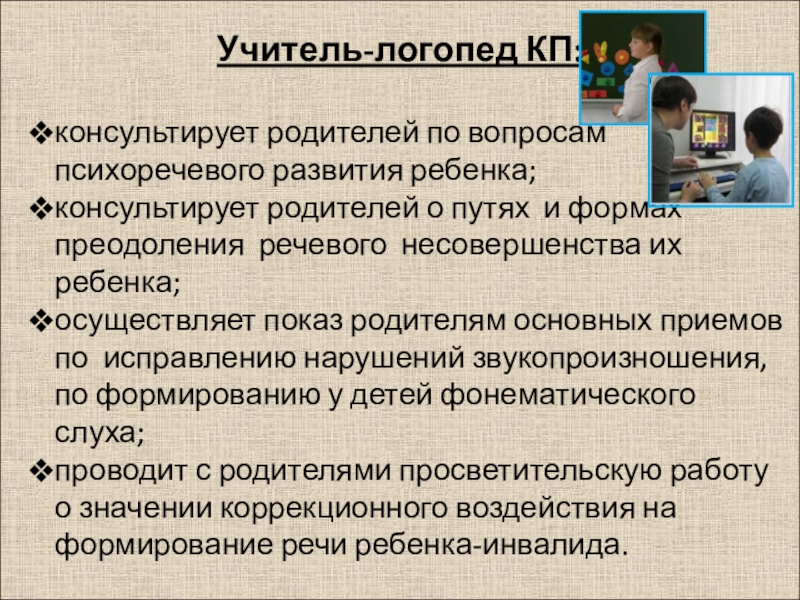 проводит с родителями просветительскую работу о значении коррекционного воздействия на формирование речи ребенка-инвалида.