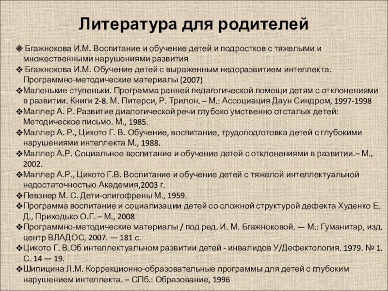Маллер А. Р., Цикото Г. В. Обучение, воспитание, трудоподготовка детей с глубокими нарушениями интеллекта М., 1988.