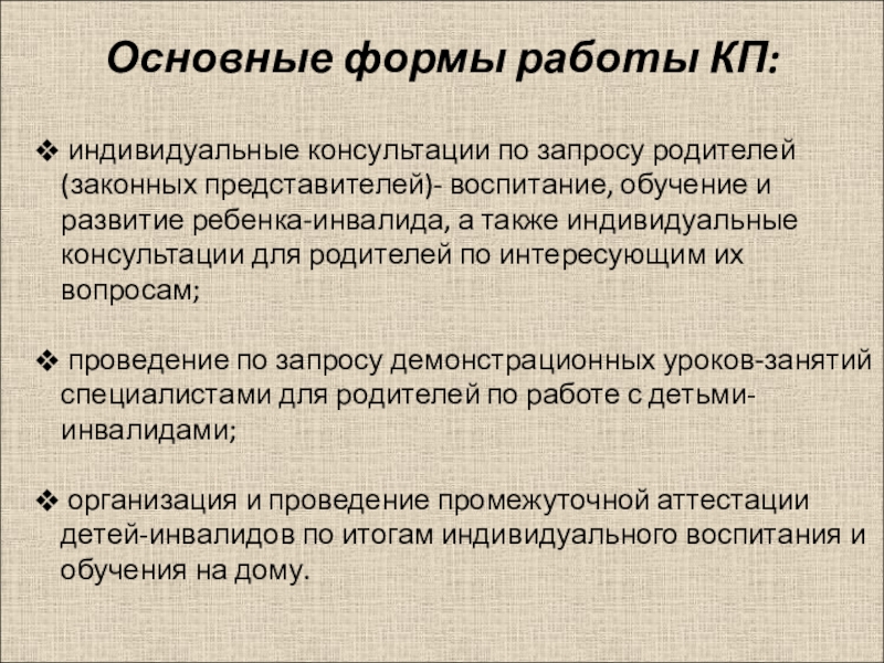 воспитание, обучение и развитие ребенка-инвалида, а также индивидуальные консультации для родителей по интересующим их вопросам;