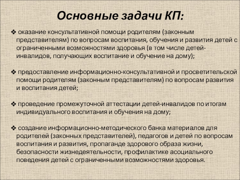 помощи семьям, воспитывающим детей с ограниченными возможностями здоровья помощи родителям (законным представителям) в воспитании, развитии и обучении детей с ограниченными возможностями здоровья от 7 до 17 лет, в том числе и обучающихся на дому.