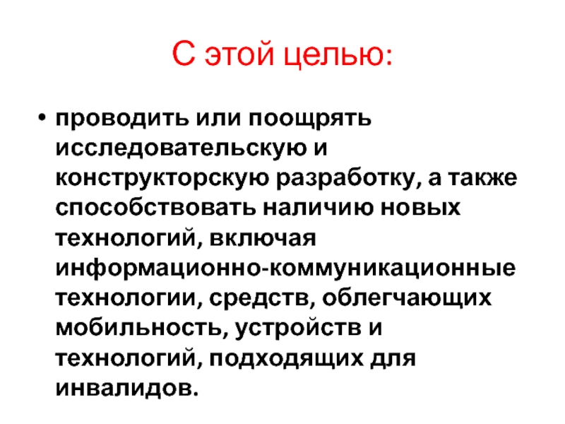 также способствовать наличию новых технологий, включая информационно-коммуникационные технологии, средств, облегчающих мобильность, устройств и технологий, подходящих для инвалидов.