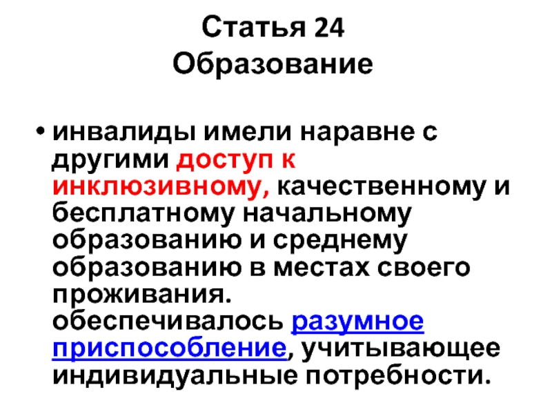 бесплатному начальному образованию и среднему образованию в местах своего проживания. обеспечивалось разумное приспособление, учитывающее индивидуальные потребности.