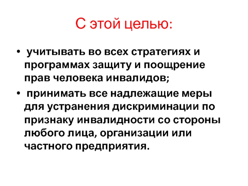 принимать все надлежащие меры для устранения дискриминации по признаку инвалидности со стороны любого лица, организации или частного предприятия.