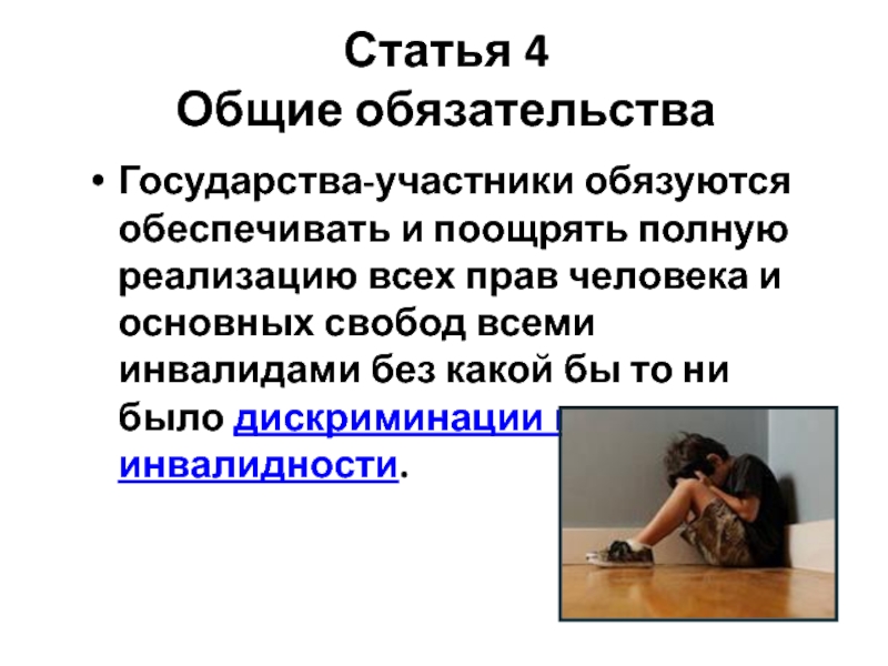 человека и основных свобод всеми инвалидами без какой бы то ни было дискриминации по признаку инвалидности.