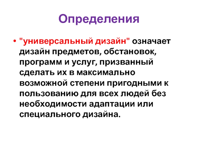 "универсальный дизайн" означает дизайн предметов, обстановок, программ и услуг, призванный сделать их