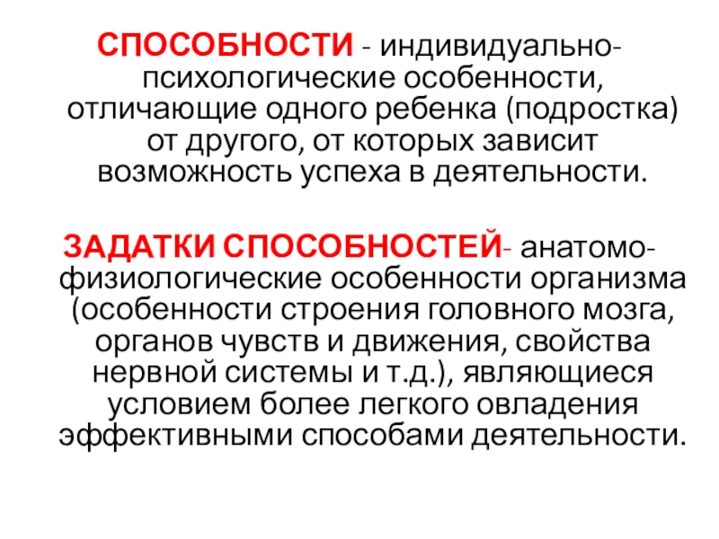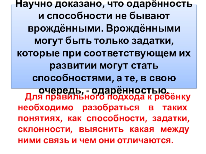 Для правильного подхода к ребёнку необходимо разобраться в таких понятиях, как способности, задатки, склонности, выяснить какая между ними связь и чем они отличаются.