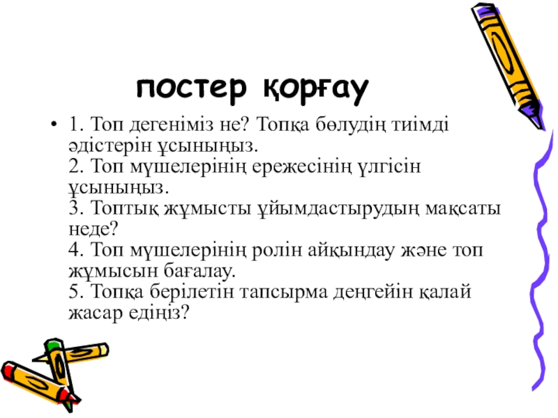 постер қорғау 1. Топ дегеніміз не? Топқа бөлудің тиімді әдістерін ұсыныңыз.  2. Топ мүшелерінің ережесінің үлгісін ұсыныңыз.