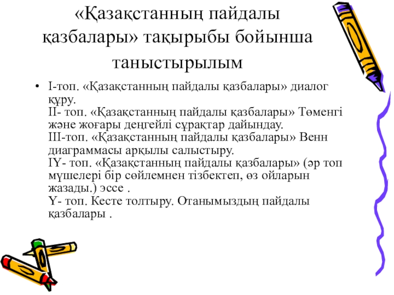«Қазақстанның пайдалы қазбалары» тақырыбы бойынша таныстырылым І-топ. «Қазақстанның пайдалы қазбалары» диалог құру.  ІІ- топ. «Қазақстанның пайдалы қазбалары»