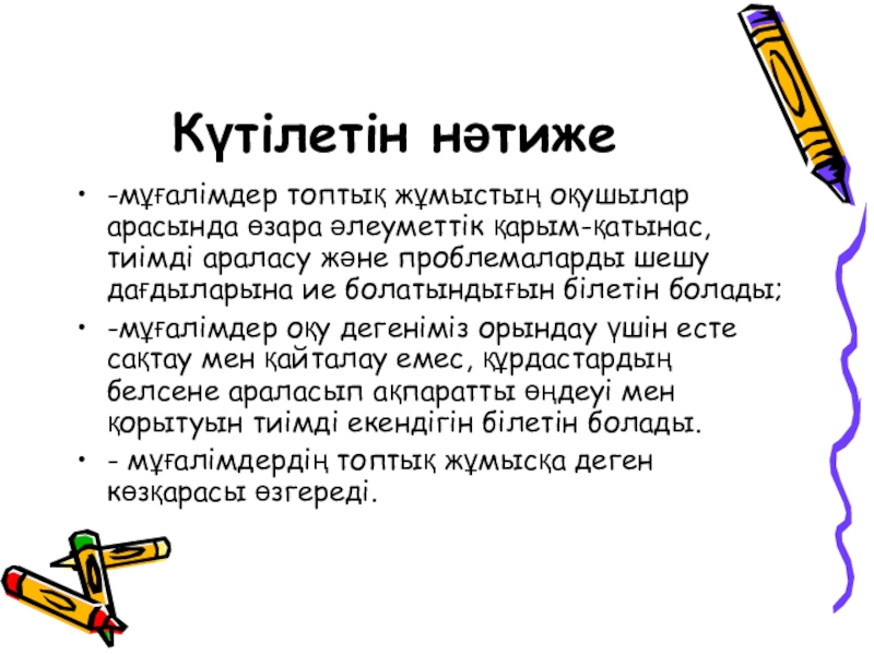 Күтілетін нәтиже -мұғалімдер топтық жұмыстың оқушылар арасында өзара әлеуметтік қарым-қатынас, тиімді араласу және проблемаларды шешу дағдыларына ие