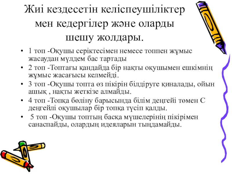 Жиі кездесетін келіспеушіліктер мен кедергілер және оларды шешу жолдары. 1 топ -Оқушы серіктесімен немесе топпен жұмыс жасаудан мүлдем