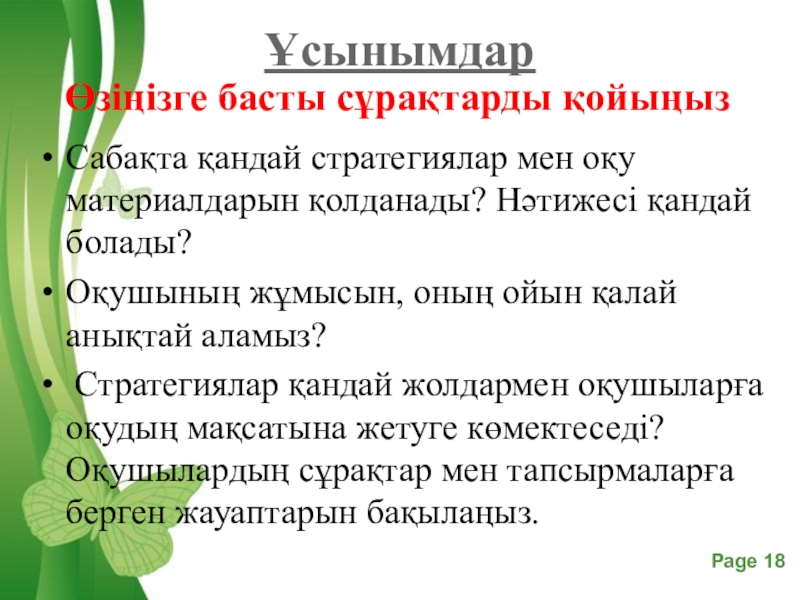 Слайд 18Сабақта қандай стратегиялар мен оқу материалдарын қолданады? Нәтижесі қандай болады?