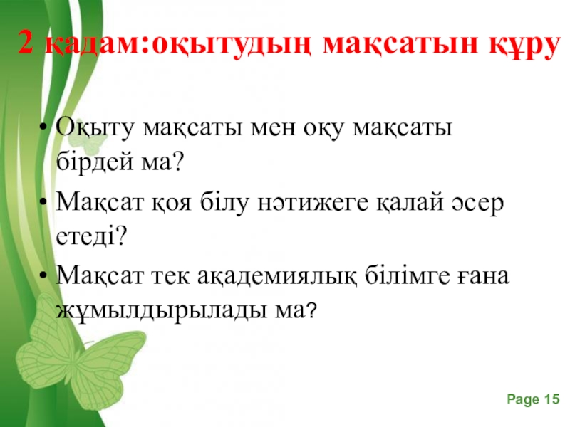 Слайд 15 2 қадам:оқытудың мақсатын құру