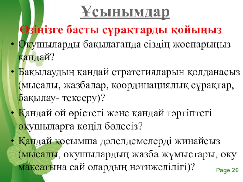 Слайд 20Оқушыларды бақылағанда сіздің жоспарыңыз қандай?