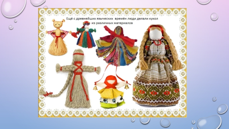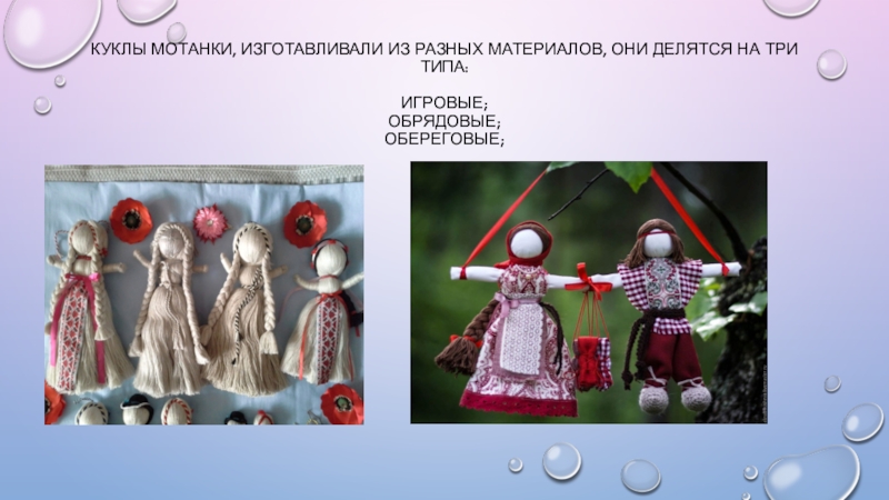 Слайд 10Куклы мотанки, изготавливали из разных материалов, они делятся на три типа: