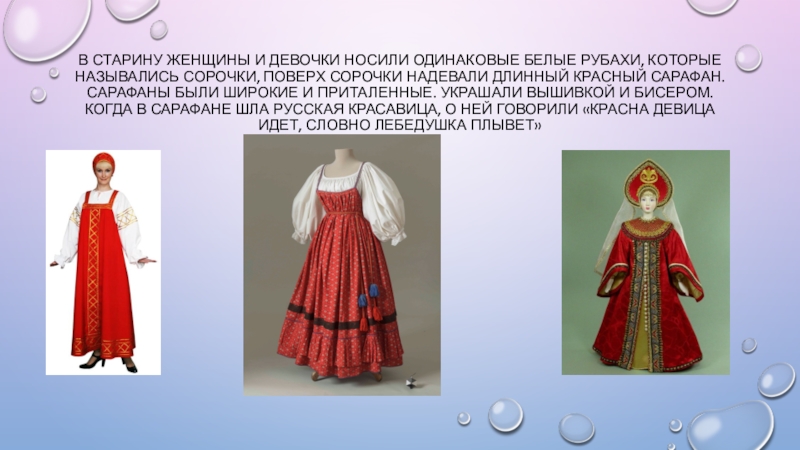 сорочки, поверх сорочки надевали длинный красный сарафан. Сарафаны были широкие и приталенные. Украшали вышивкой и бисером. Когда в сарафане шла русская красавица, о ней говорили «красна девица идет, словно лебедушка плывет»