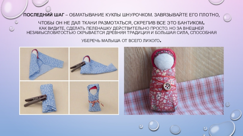 Слайд 17Последний шаг – обматывание куклы шнурочком. Завязывайте его плотно, чтобы он