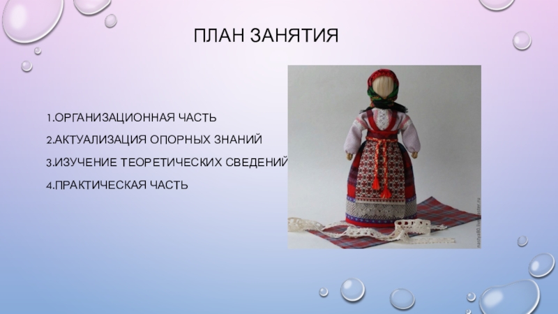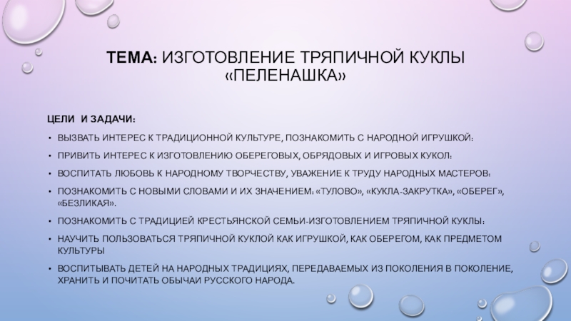 Слайд 2Тема: Изготовление тряпичной куклы «Пеленашка»