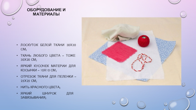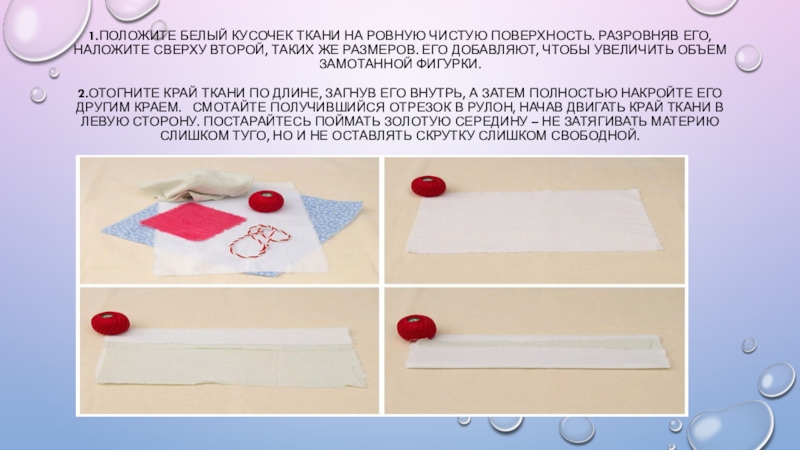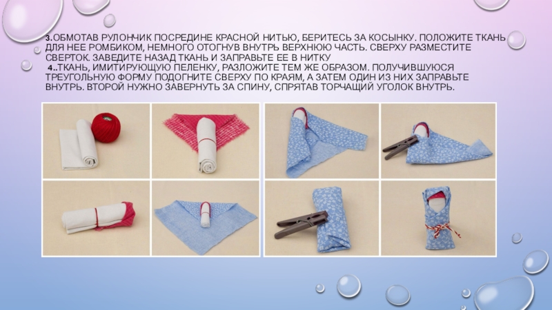 Слайд 163.Обмотав рулончик посредине красной нитью, беритесь за косынку. Положите ткань для