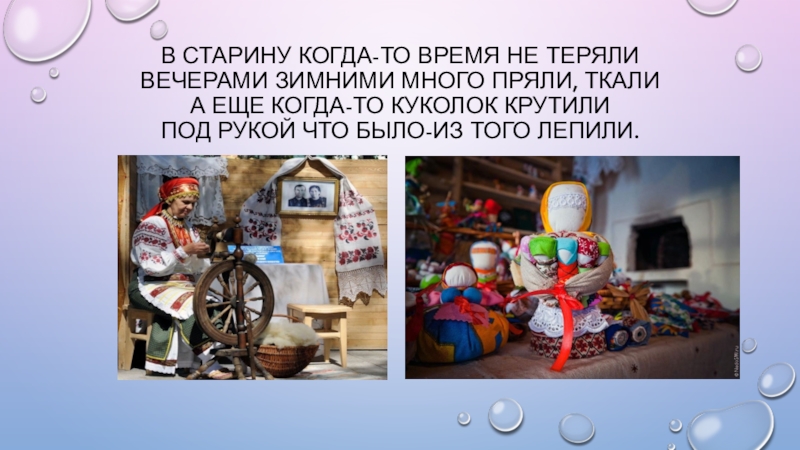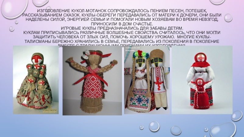 Слайд 12Изготовление кукол-мотанок сопровождалось пением песен, потешек, рассказыванием сказок. Куклы-обереги передавались от