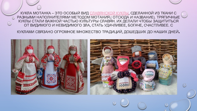 разными наполнителями методом мотания.( Отсюда и название). Тряпичные куклы стали важной частью культуры славян. Их делали чтобы защититься от видимого и невидимого зла, стать удачливее, богаче, счастливее. С куклами связано огромное множество традиций, дошедших до наших дней.