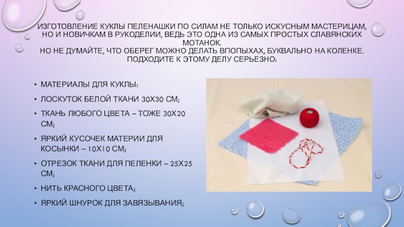 Слайд 14Изготовление куклы Пеленашки по силам не только искусным мастерицам, но и